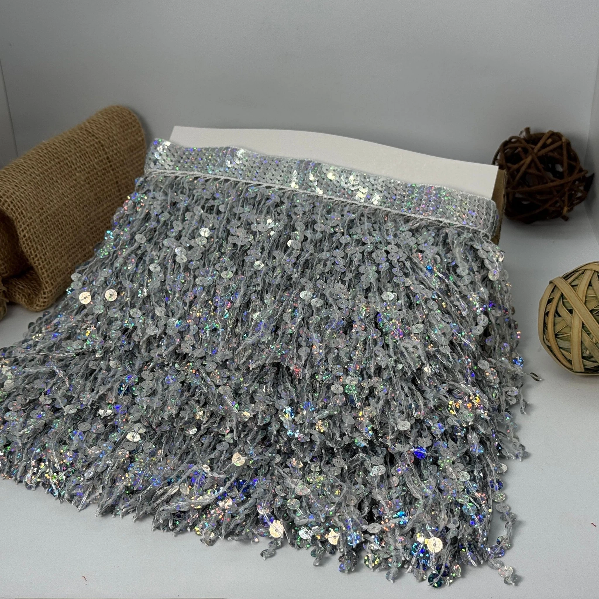 Бахрома танцювальна з паєткою — декоративна тасьма з довгими нитками, прикрашеними блискучими паєтками. Легка, еластична та динамічна, вона красиво рухається під час танцю, створюючи ефект мерехтіння.