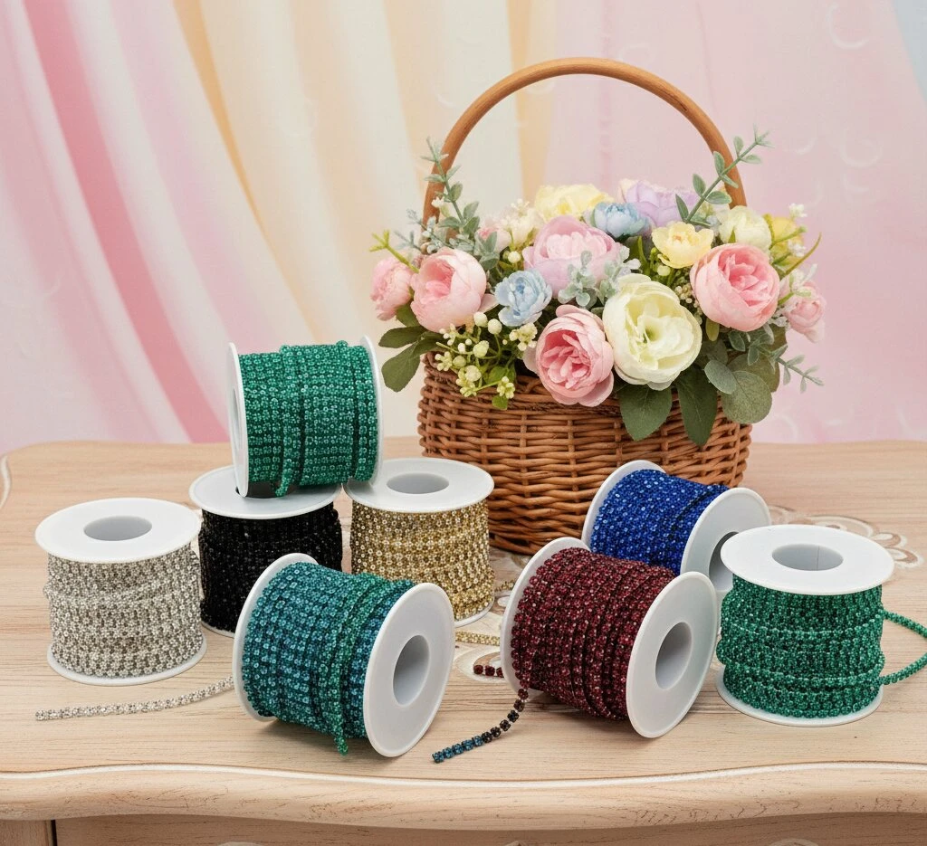 Цепи з каменями — декоративні елементи від Мереживо UA, що поєднують металеву основу та вбудовані камінці для яскравого блиску й ефектного вигляду. Вони легко прикріплюються до одягу, аксесуарів або виробів, створюючи стильний та розкішний декор.