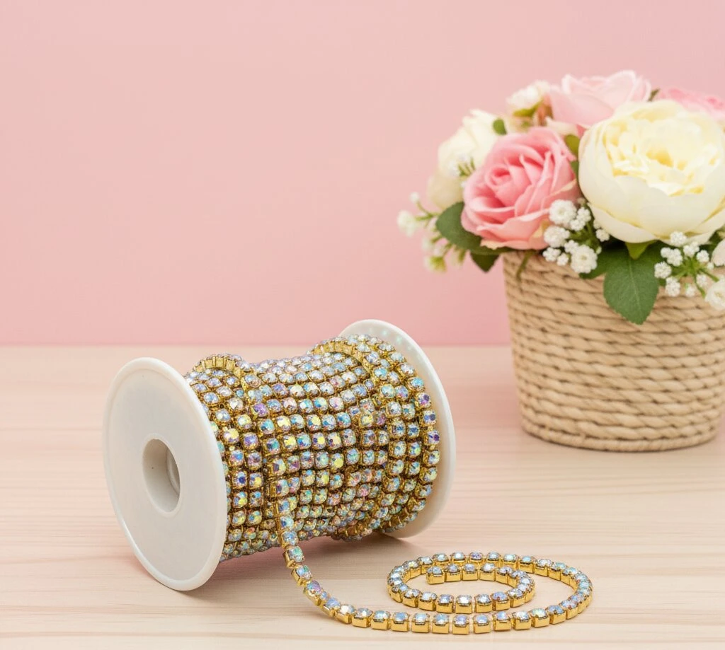 Цепи з каменями — декоративні елементи від Мереживо UA, що поєднують металеву основу та вбудовані камінці для яскравого блиску й ефектного вигляду. Вони легко прикріплюються до одягу, аксесуарів або виробів, створюючи стильний та розкішний декор.