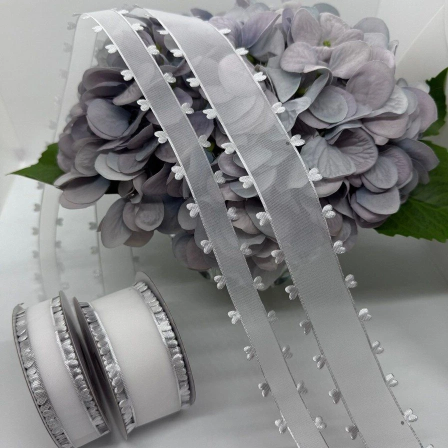 Стрічка з органзи з сердечками — ніжна, легка та напівпрозора стрічка з блиском, прикрашена милими сердечками.