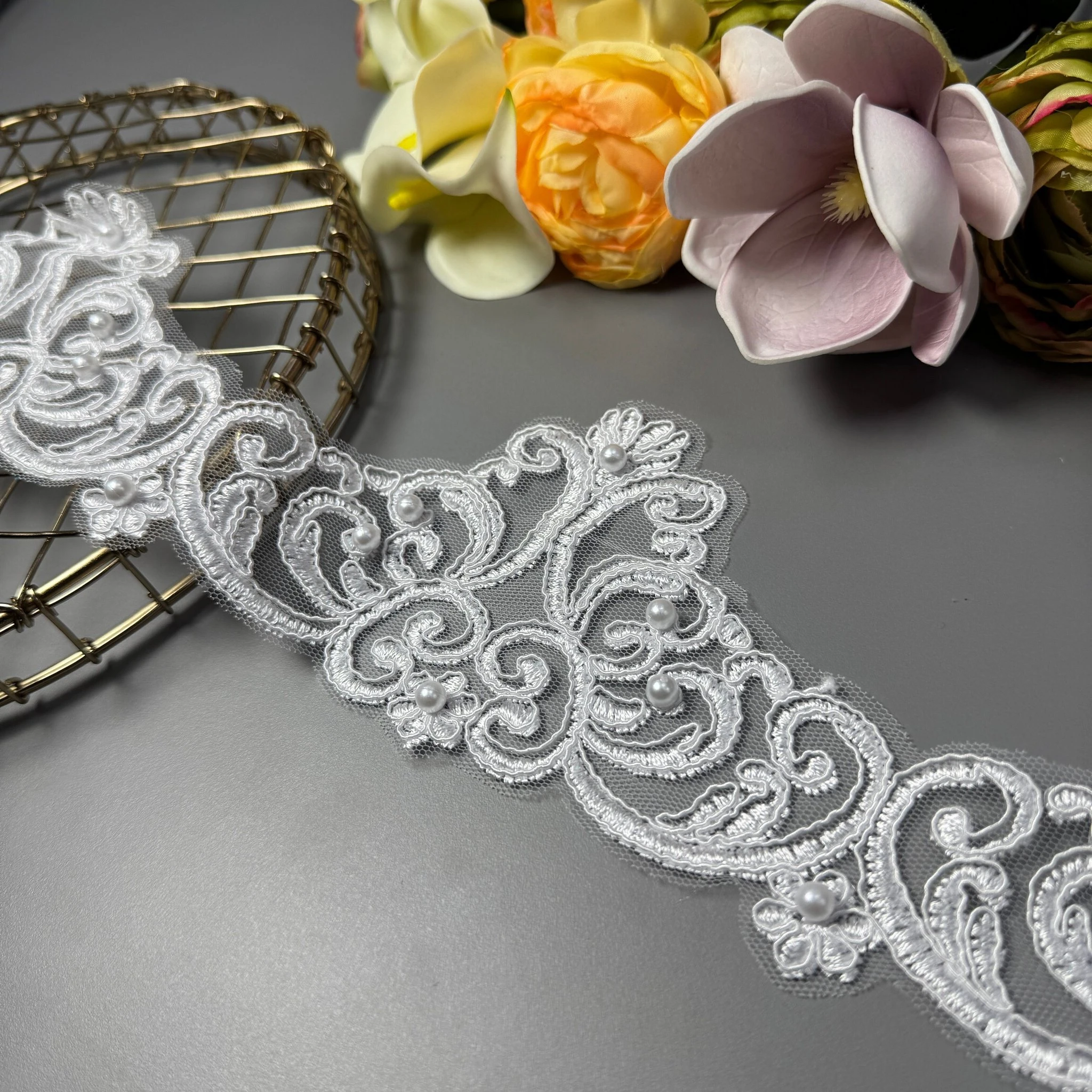 Мереживо з кордовою ниткою та перлами — декоративне мереживо з об’ємним візерунком із кордової нитки, прикрашене ніжними перлинами. Воно виглядає вишукано та святково, додаючи виробам розкоші та елегантності.