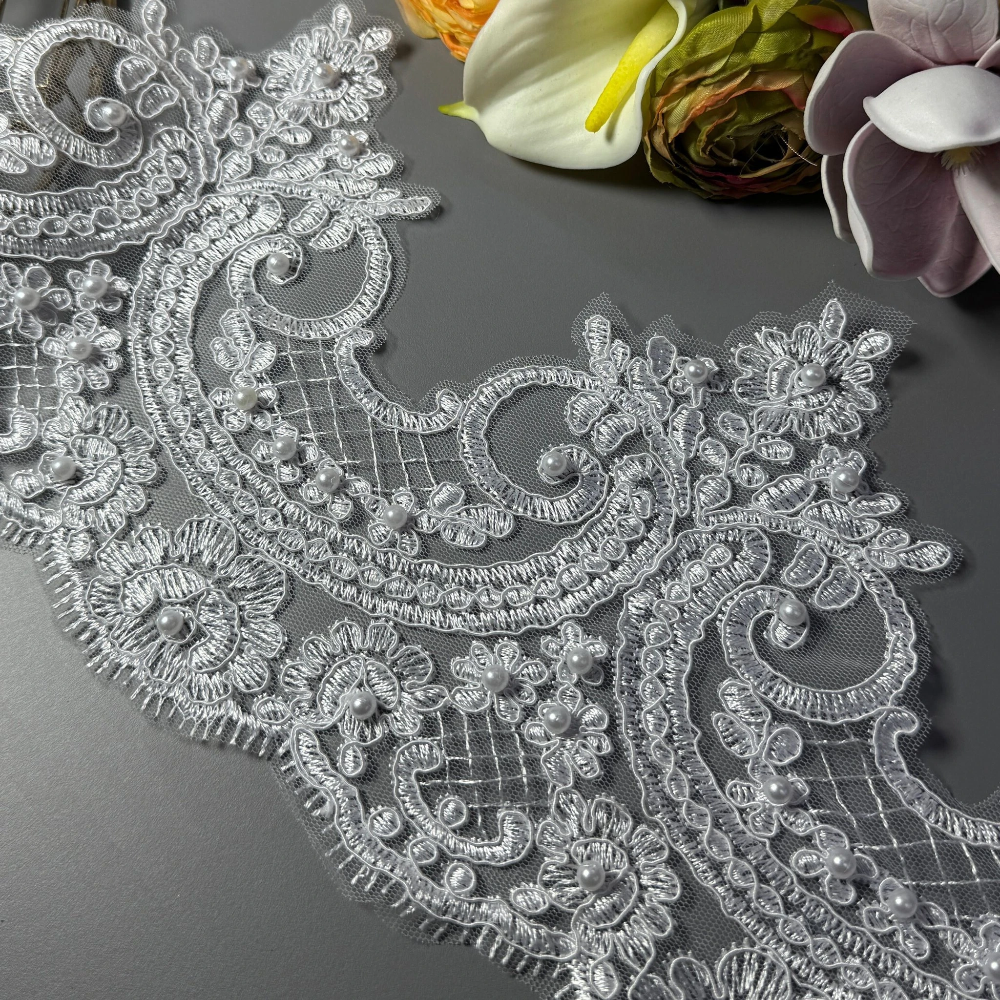 Мереживо з кордовою ниткою та перлами — декоративне мереживо з об’ємним візерунком із кордової нитки, прикрашене ніжними перлинами. Воно виглядає вишукано та святково, додаючи виробам розкоші та елегантності.