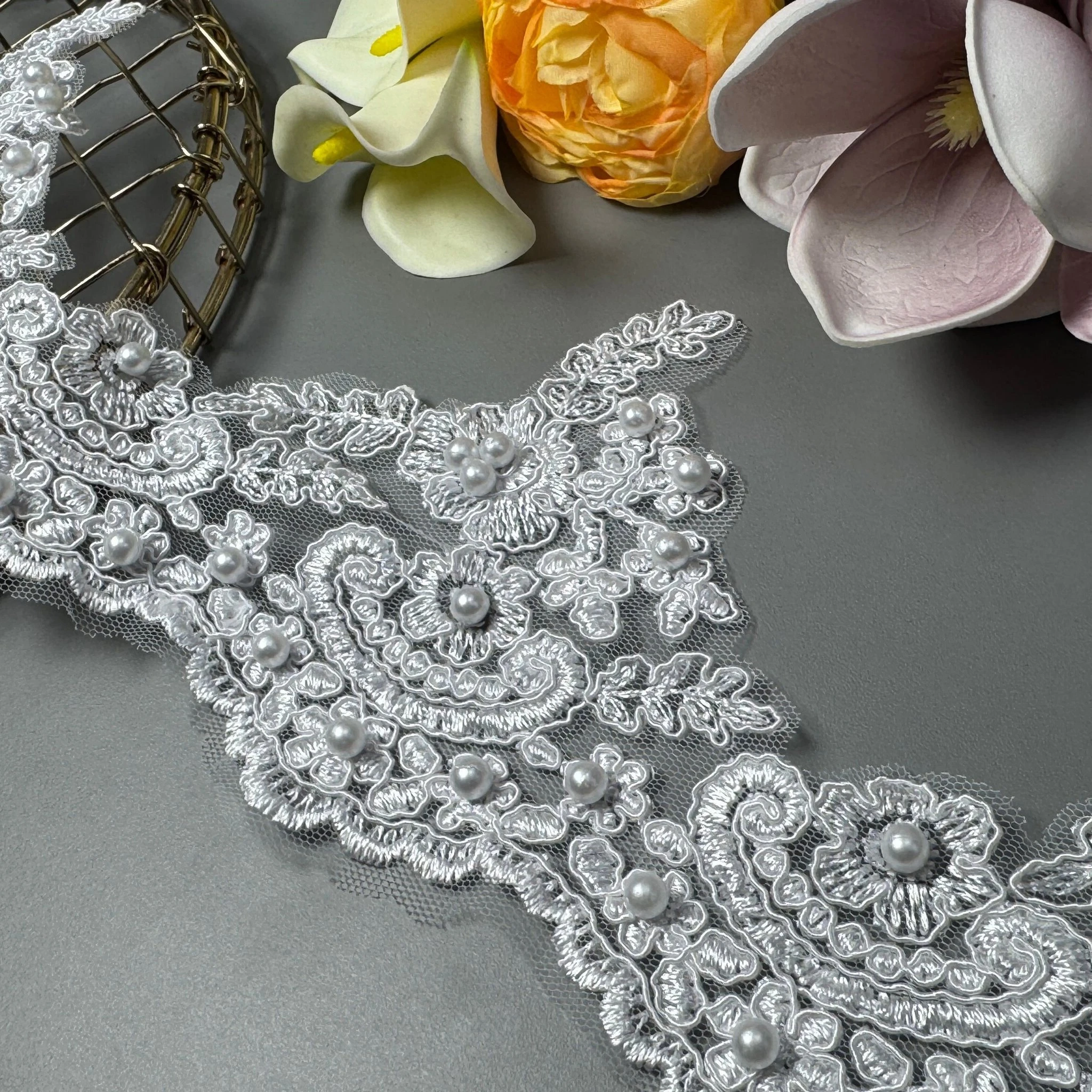 Мережево з кордовую ниткою «Молочний жасмин»А+перли 12 см (1 метр), білий