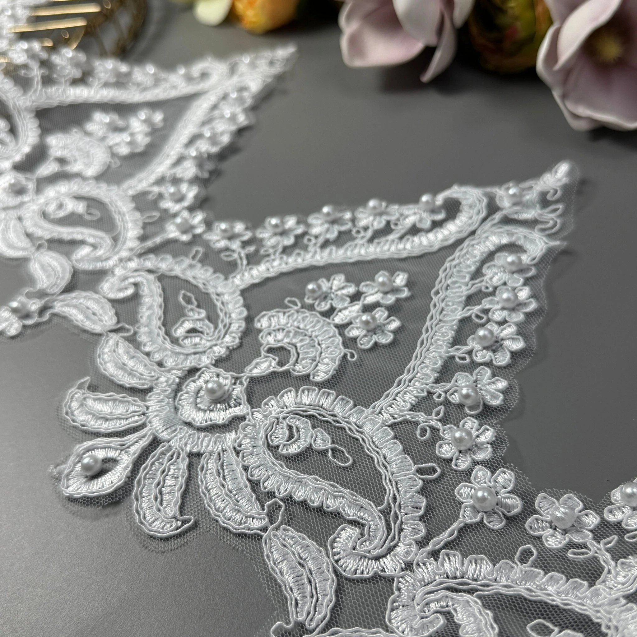 Мереживо з кордовою ниткою та перлами — декоративне мереживо з об’ємним візерунком із кордової нитки, прикрашене ніжними перлинами. Воно виглядає вишукано та святково, додаючи виробам розкоші та елегантності.