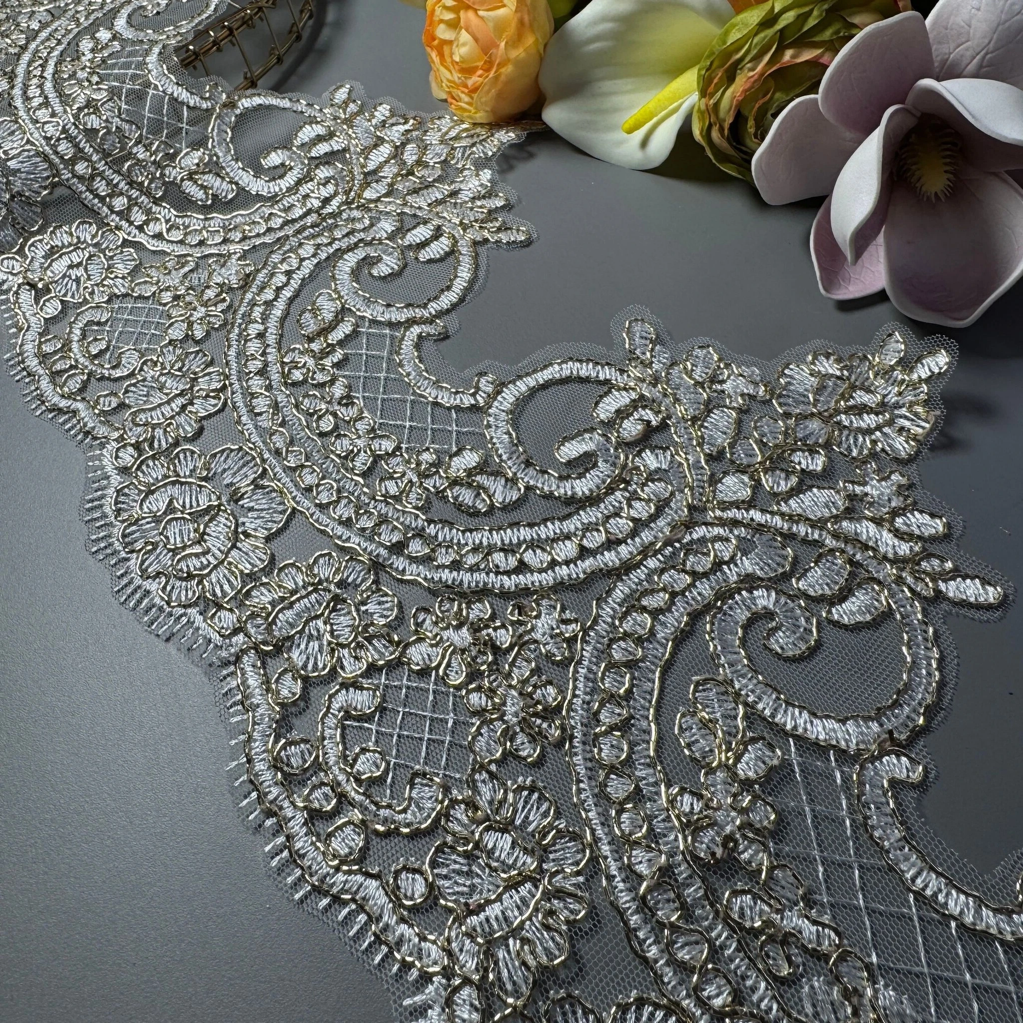 Мереживо з кордовою ниткою та люрексом — вишукане декоративне мереживо з об’ємним візерунком з кордової нитки та блискучими люрексовими вставками. Воно виглядає святково та елегантно, додаючи виробам розкоші та шарму.
