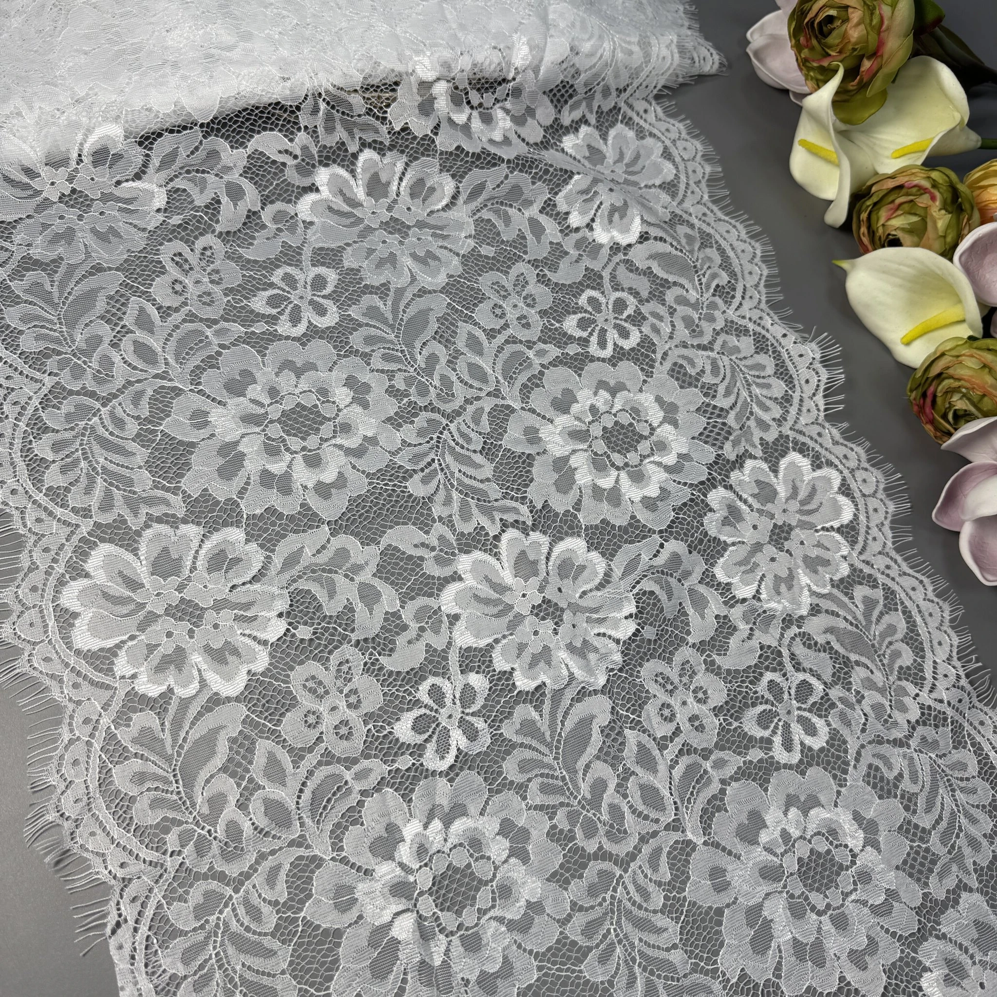 Ніжне плетіння, витончений візерунок і легкість тканини роблять це мереживо ідеальним для весільних суконь, вечірнього вбрання, білизни та елітного декору.