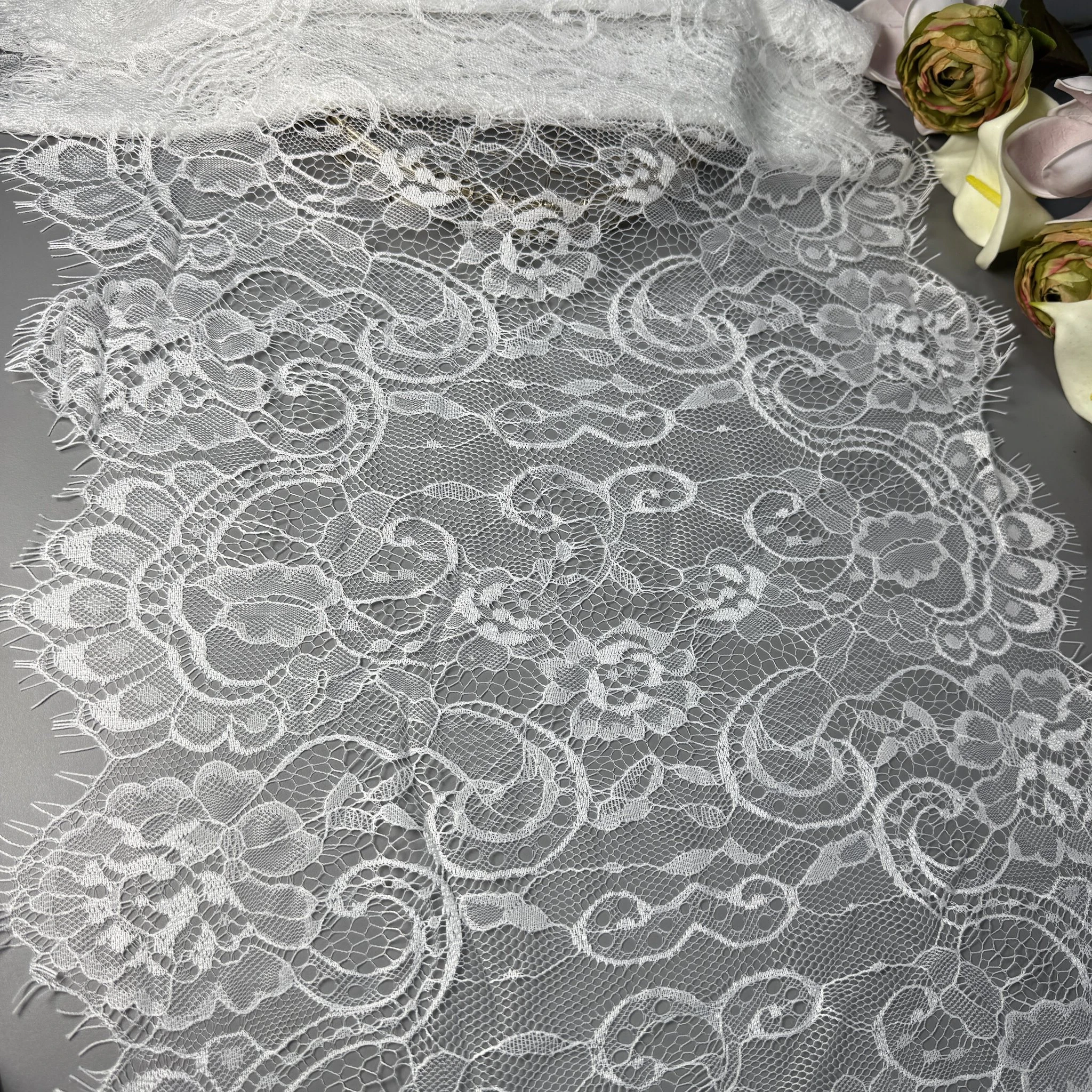 Ніжне плетіння, витончений візерунок і легкість тканини роблять це мереживо ідеальним для весільних суконь, вечірнього вбрання, білизни та елітного декору.