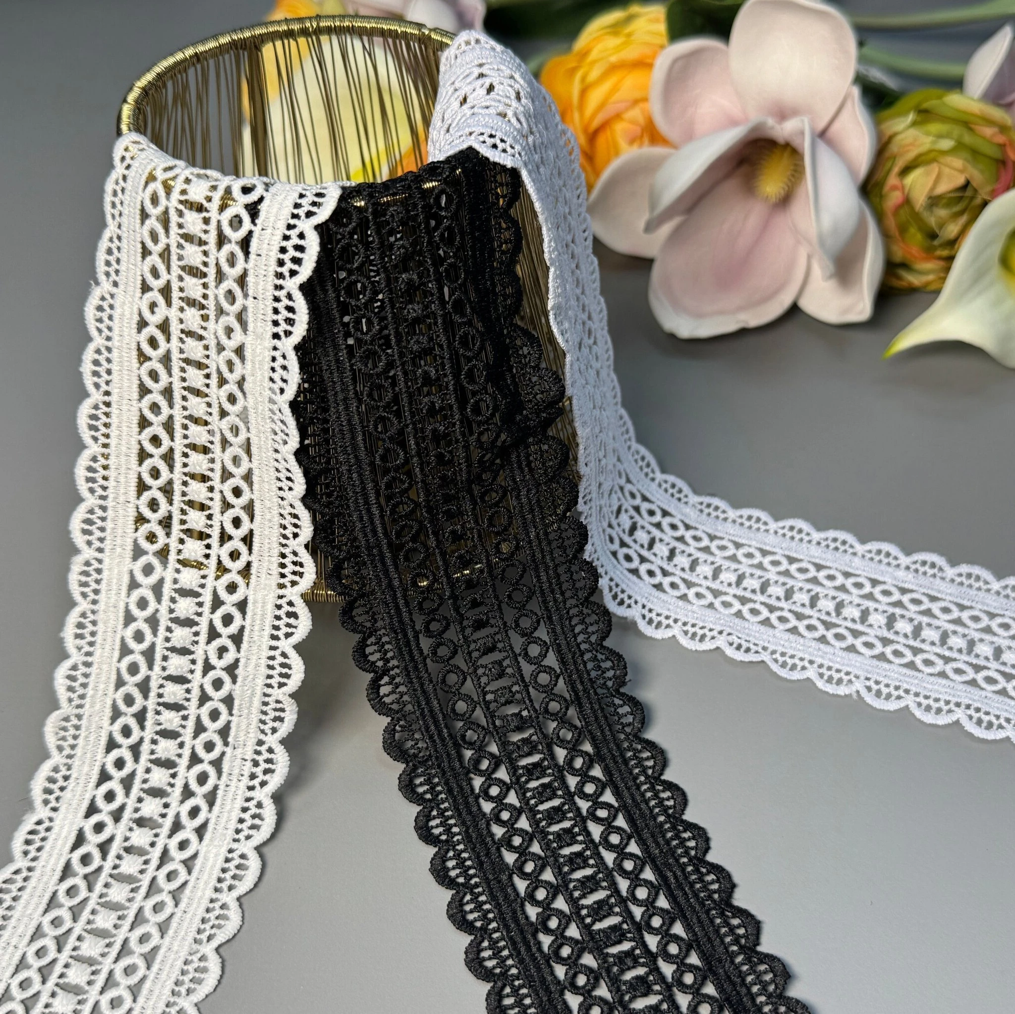 М’яке, міцне й зносостійке мереживо з поліестеру чудово підходить для оздоблення суконь, блуз, спідниць, білизни, аксесуарів та декору.