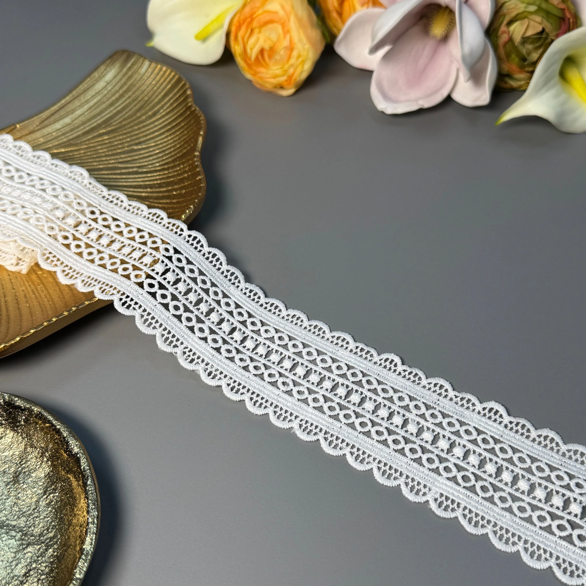 М’яке, міцне й зносостійке мереживо з поліестеру чудово підходить для оздоблення суконь, блуз, спідниць, білизни, аксесуарів та декору.