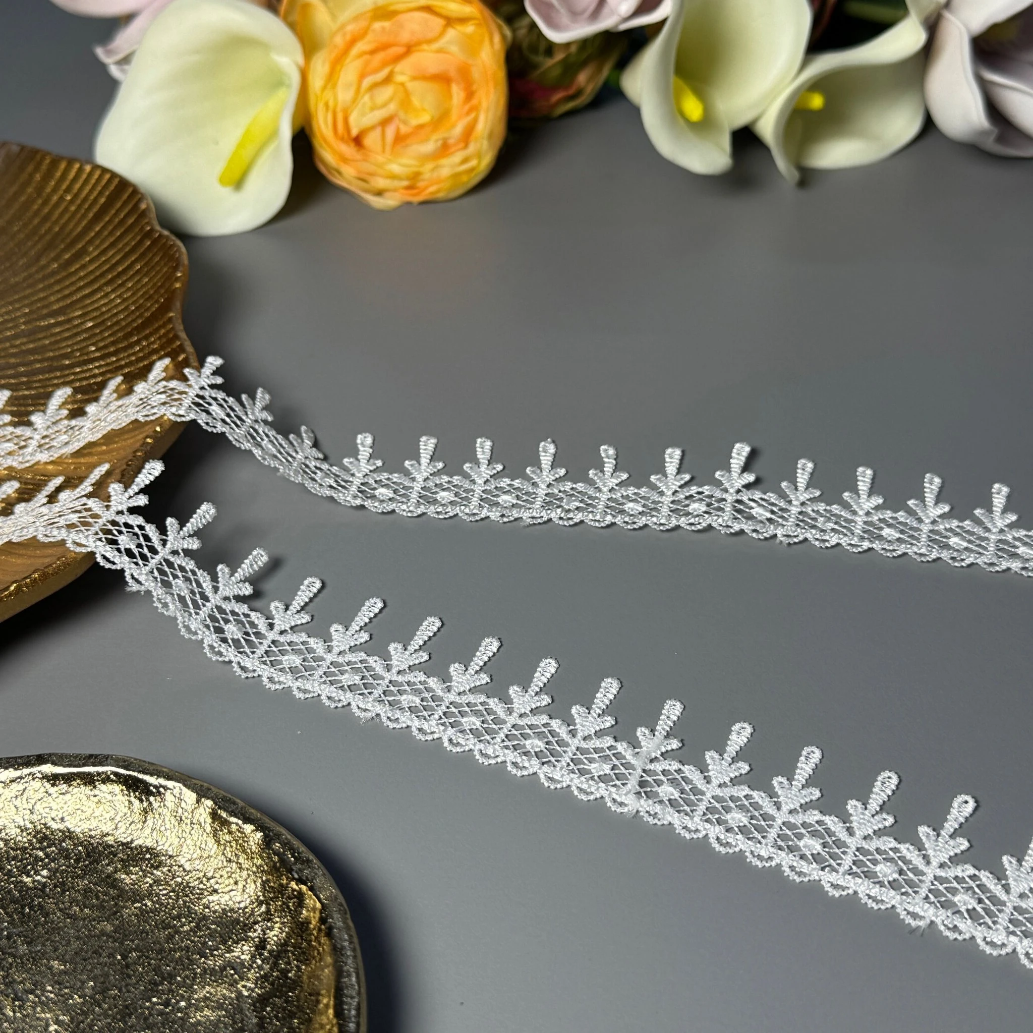 М’яке, міцне й зносостійке мереживо з поліестеру чудово підходить для оздоблення суконь, блуз, спідниць, білизни, аксесуарів та декору.