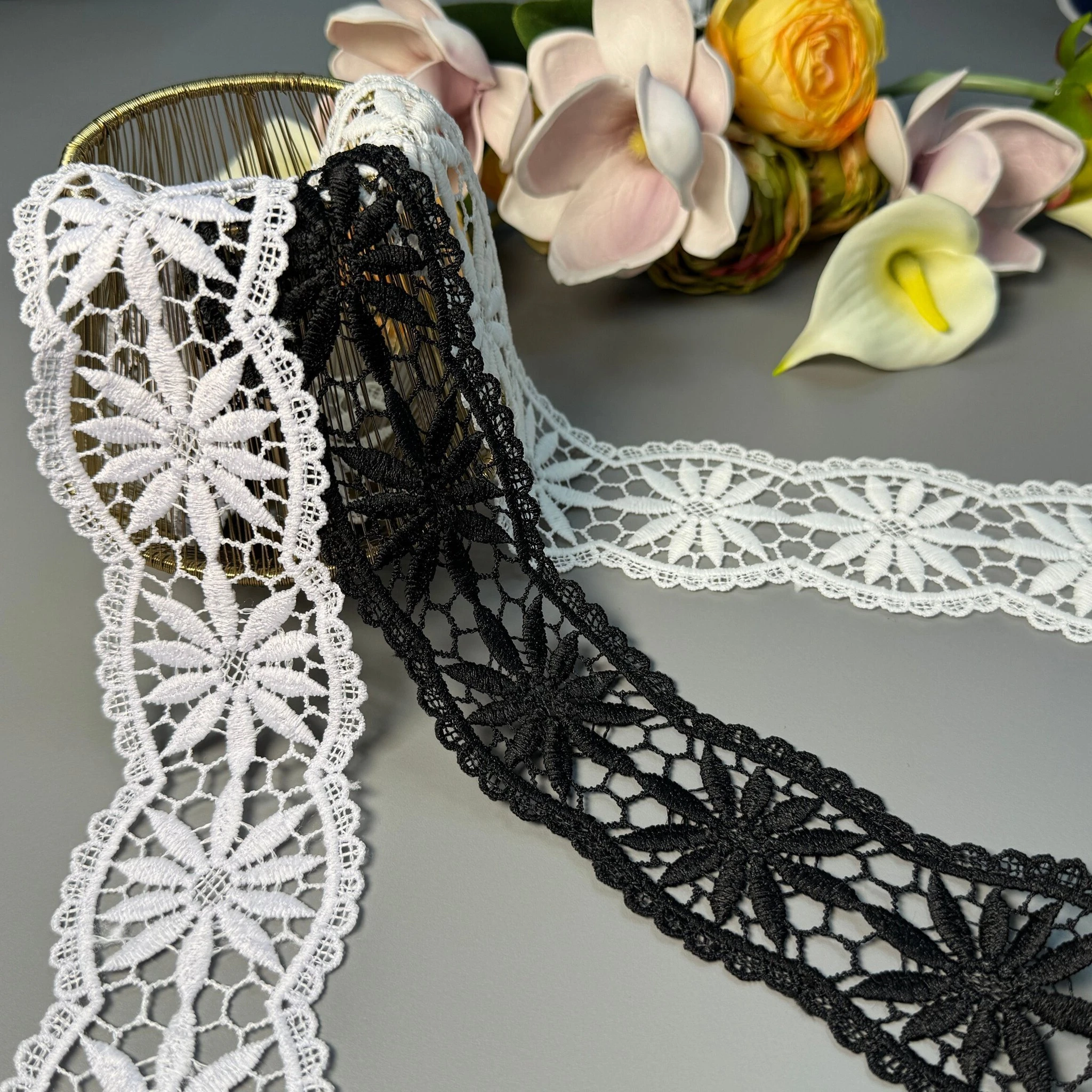 М’яке, міцне й зносостійке мереживо з поліестеру чудово підходить для оздоблення суконь, блуз, спідниць, білизни, аксесуарів та декору.