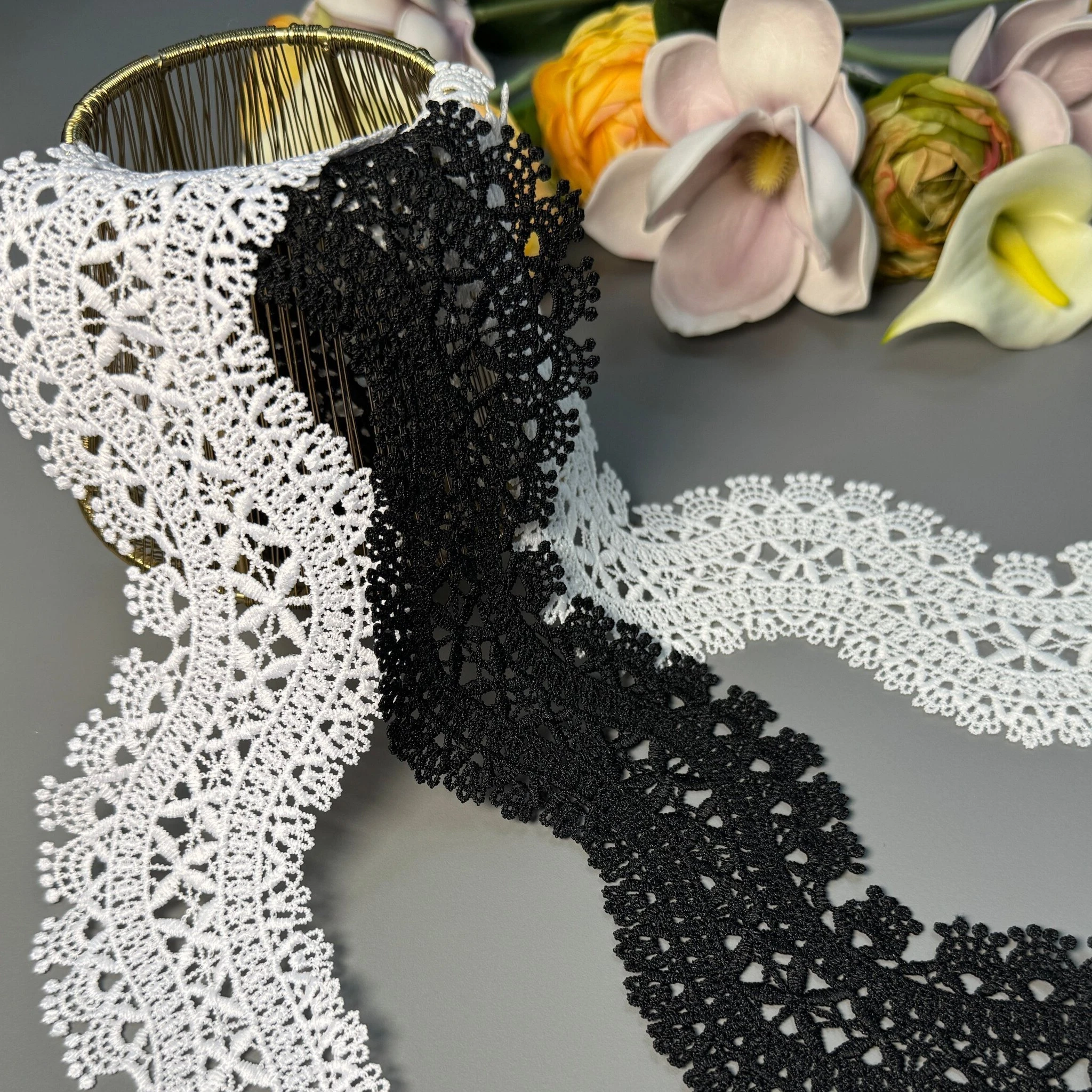 М’яке, міцне й зносостійке мереживо з поліестеру чудово підходить для оздоблення суконь, блуз, спідниць, білизни, аксесуарів та декору.