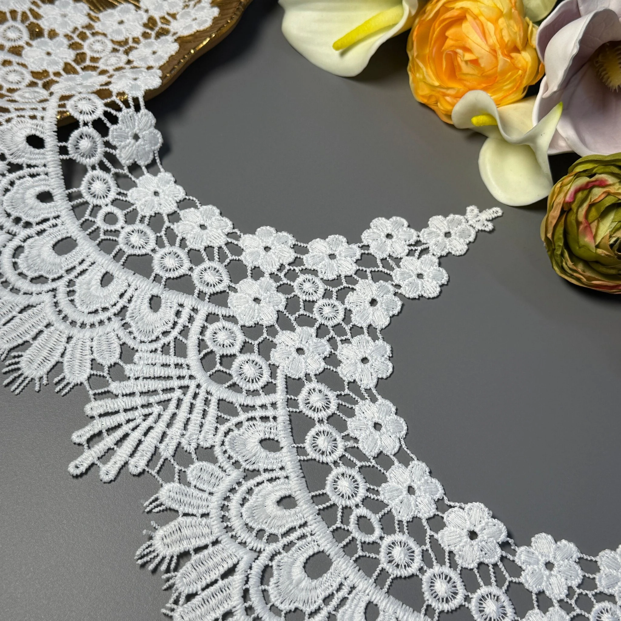 М’яке, міцне й зносостійке мереживо з поліестеру чудово підходить для оздоблення суконь, блуз, спідниць, білизни, аксесуарів та декору.