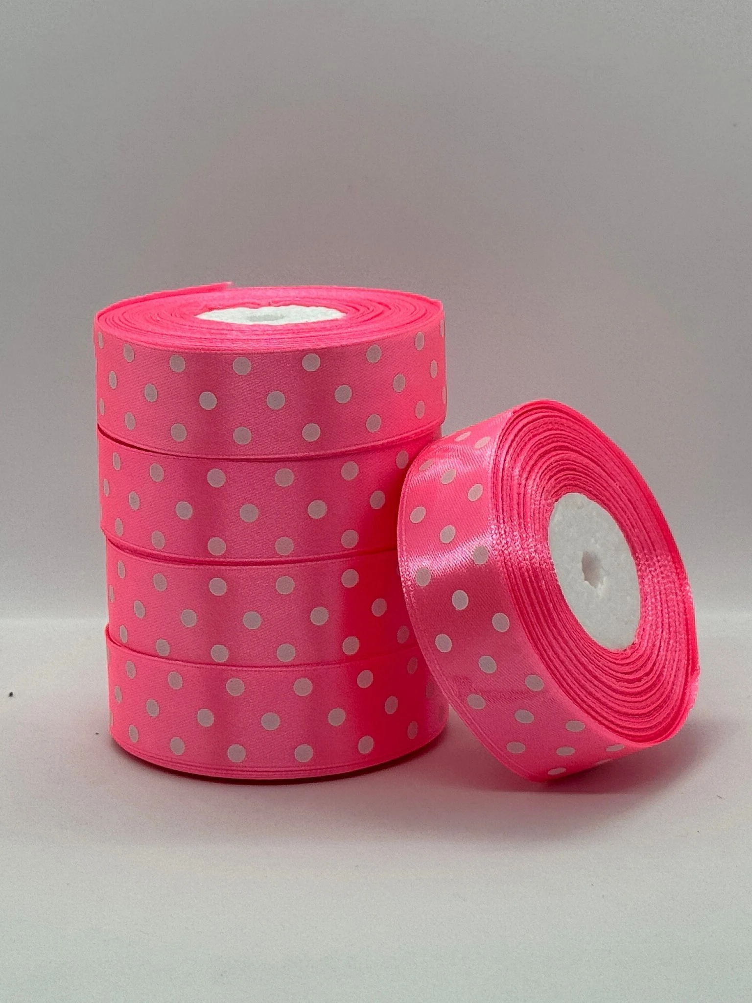 Атласна стрічка в горох 2.5 см (33 м.), 05 рожевий + білий
