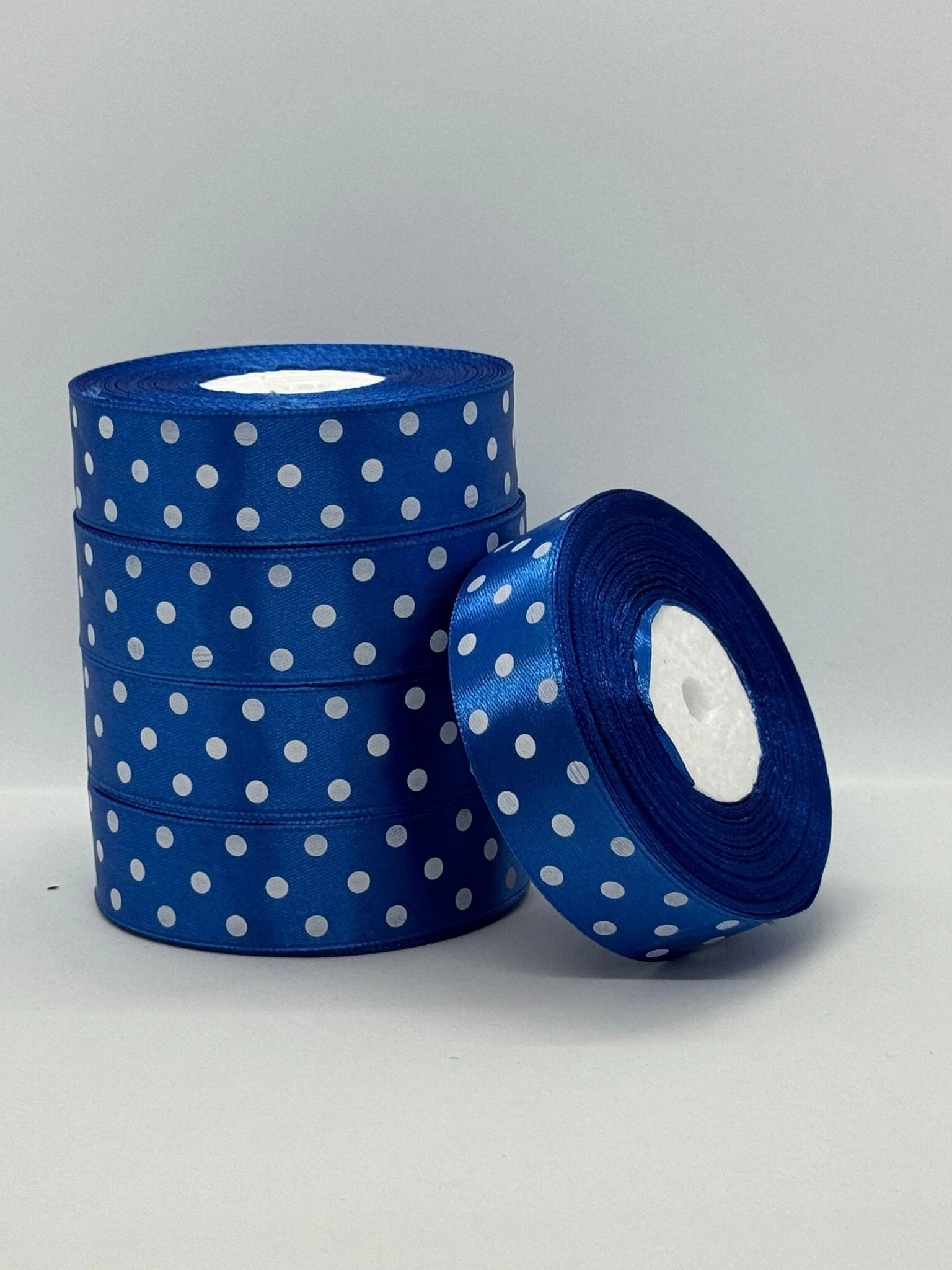 Атласна стрічка в горох 2.5 см (33 м.), 40 електрик + білий