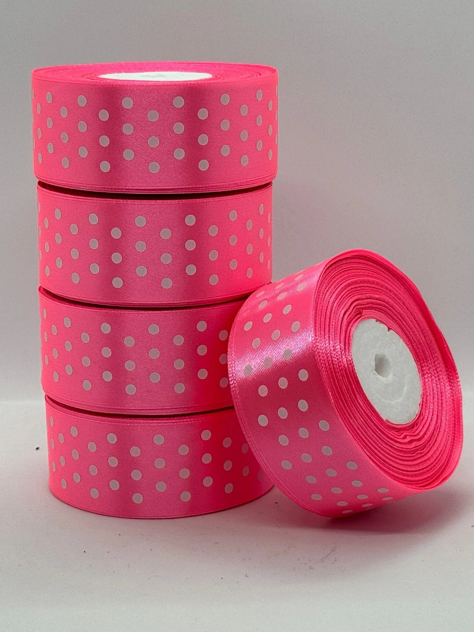Атласна стрічка в горох 4 см (33 м.), 05 рожевий + білий