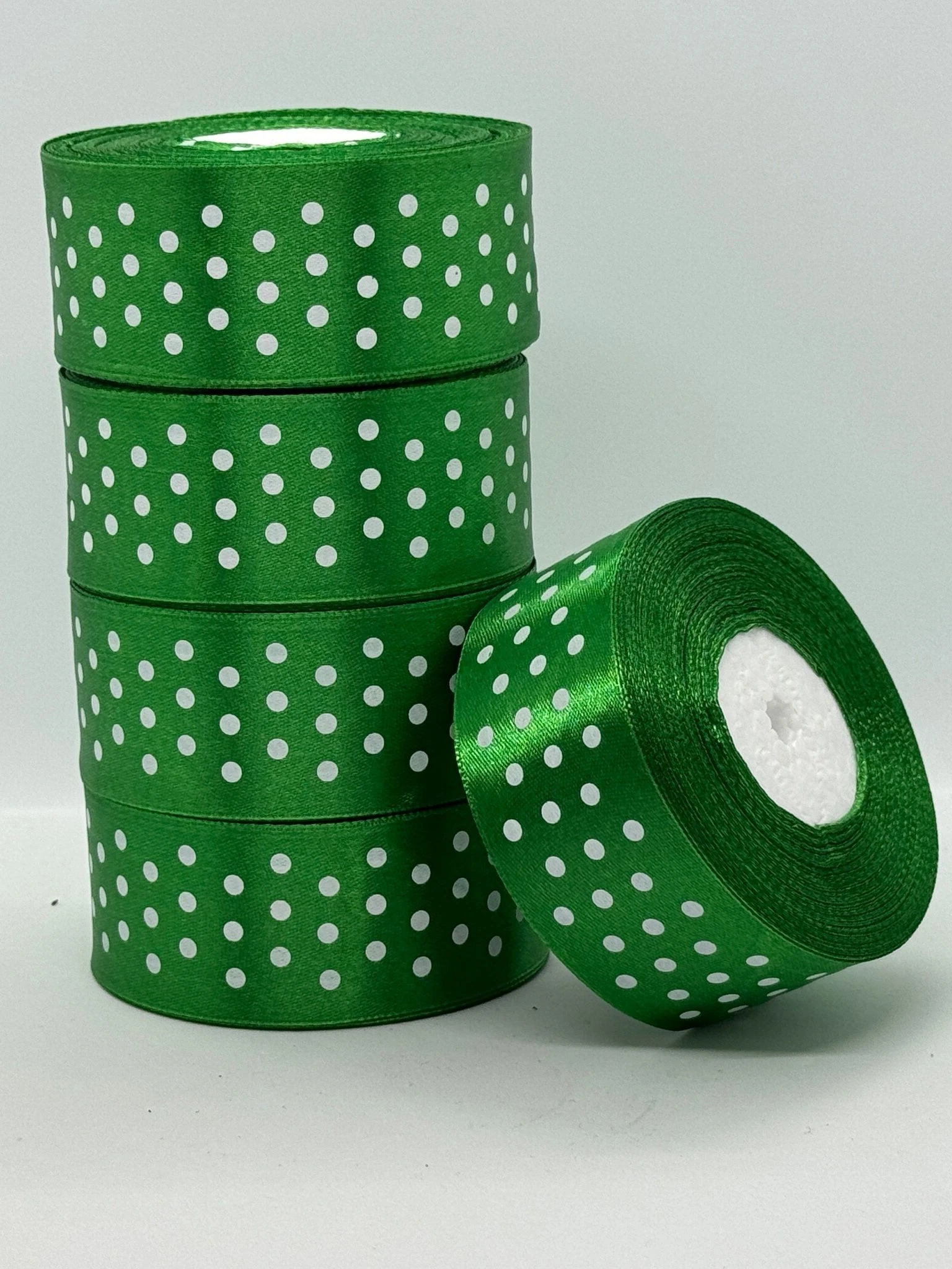 Атласна стрічка в горох 4 см (33 м.), 19 зелений + білий