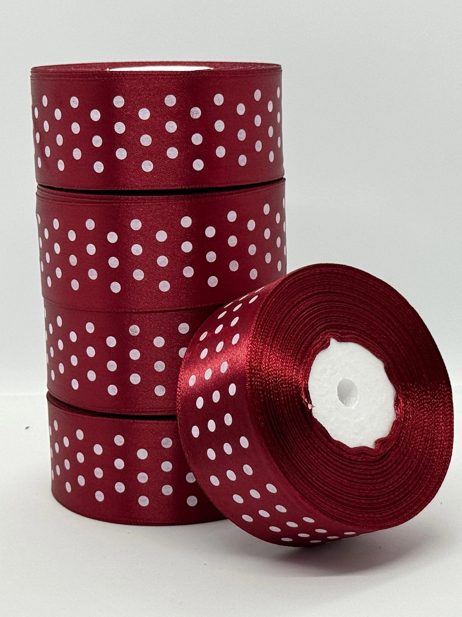 Атласна стрічка в горох 4 см (33 м.), 48 бордовий + білий