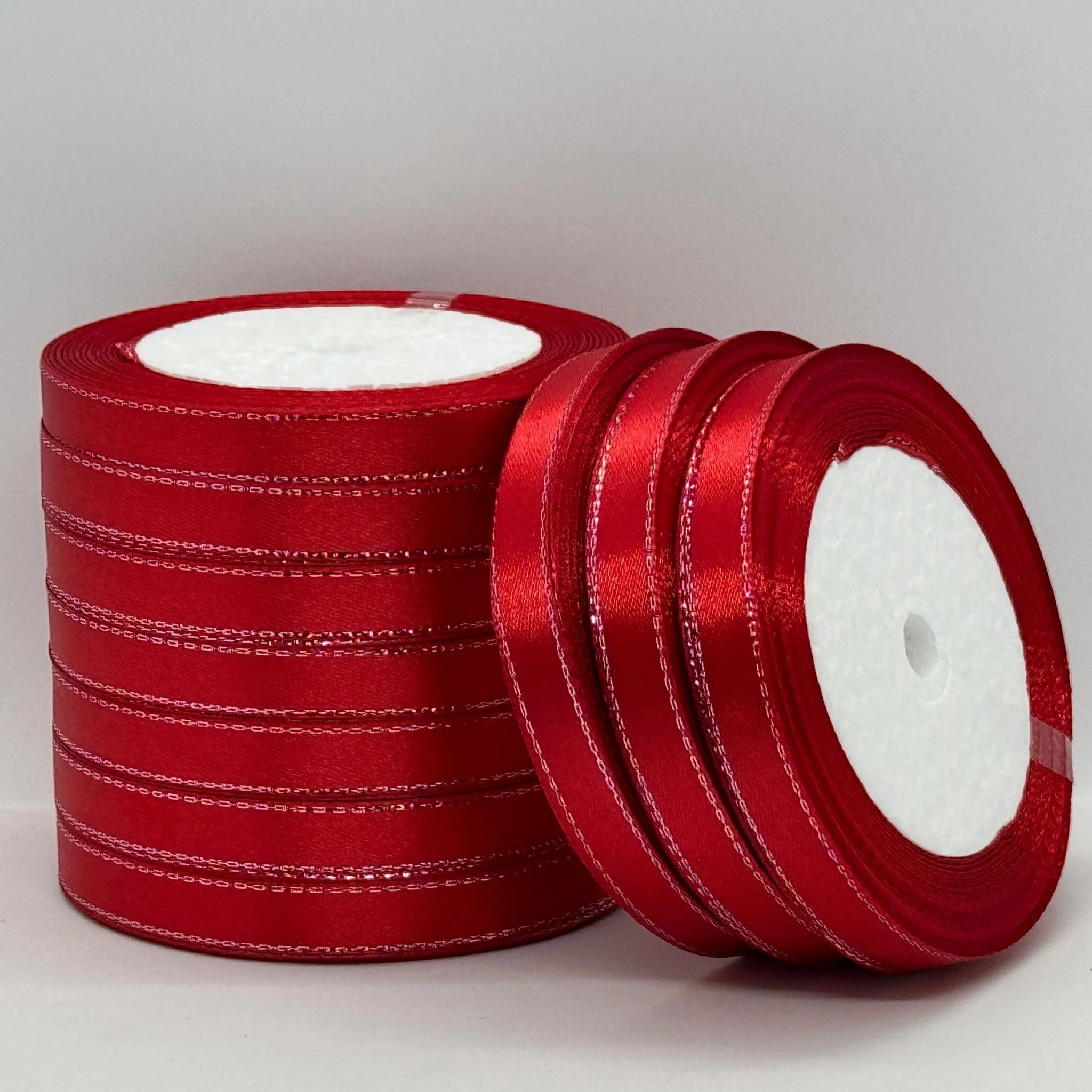 Атласна стрічка з люрекс 1 см+срібло (22.75 м), 163 червоний