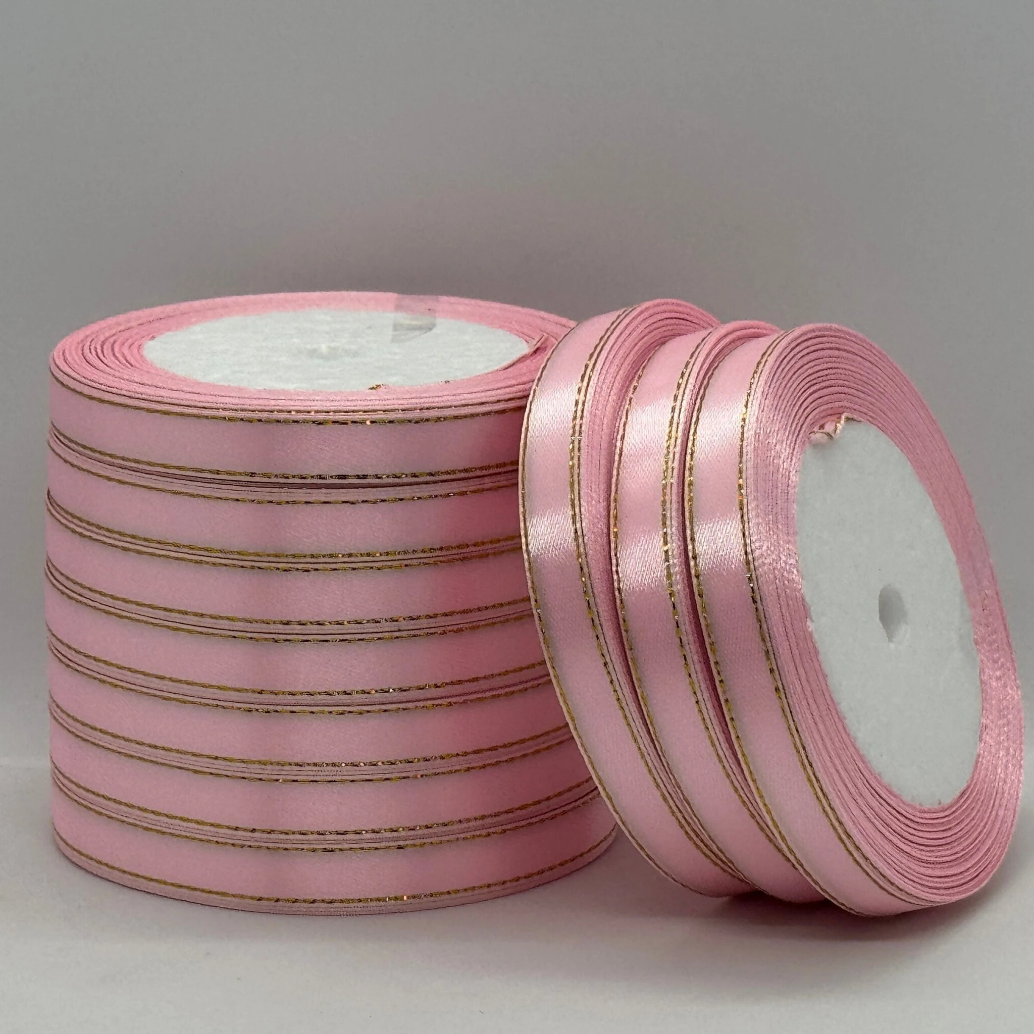 Атласна стрічка з люрекс 1 см+золото (22.75 м), 04 світло рожевий